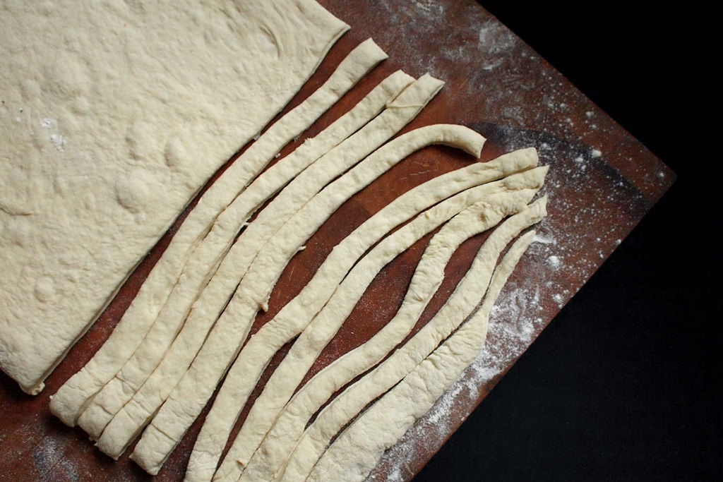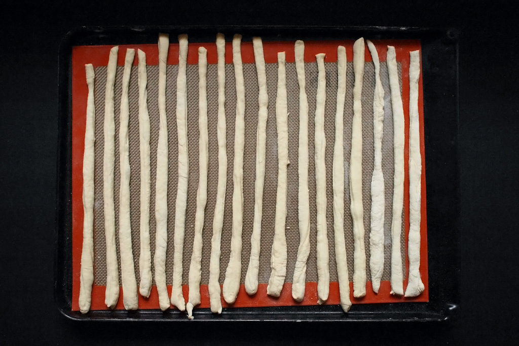 Zapněte troubu na 170 stupňů. Vezměte si obyčejný nůž, kráječ na pizzu nebo krájecí radélko a těsto postupně řezejte na žížaly s tloušťkou okolo 1 cm. Každou žížalu lehce srolujte a zároveň překulte na plech s pečícím papírem, dokud nebudete mít plech plný. Na tvaru opravdu moc nezáleží — těsto se ještě mírně nafoukne a vyhladí.