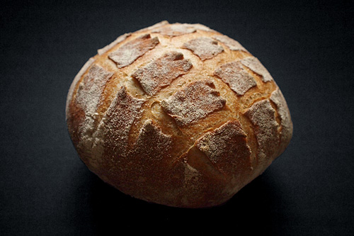 Až budete trouba rozpálená a těsto dokynuté, rychle překulte bochník na rozpálený plech v troubě. Hned potom stříkněte trochu vody na dno pekáče — voda se rychle odpaří. Stříkání zopakujte ještě dvakrát v minutovém intervalu. Po deseti minutách snižte teplotu na 230 stupňů a po dalších deseti minutách chleba zkontrolujte. Jakmile je kůrka hezky zlatá a bochník bude při poklepání znít dutě, máte hotovo!