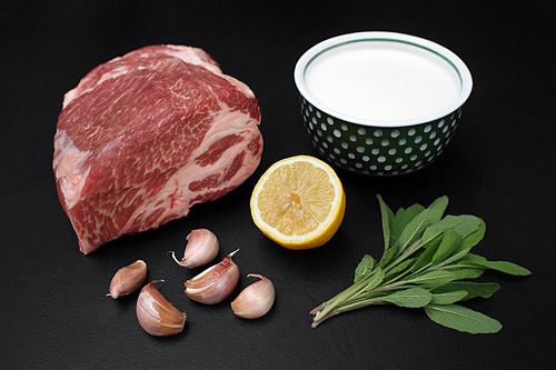 Osolte maso ze všech stran a dejte ho do litinového hrnce nebo pekáčku s poklicí. Zalijte maso mlékem do tří čtvrtin výšky. Nastrouhejte do hrnce kůru z citrónu a vymačkejte z něj do mléka i šťávu. Přidejte stroužek česneku a snítku šalvěje. Pečte v troubě při teplotě 160 °C s mírně pootevřenou poklicí alespoň dvě hodiny.