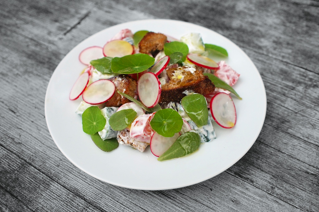Tady na obrázku je jedna ze stovky variant, kterou si snadno můžete dát dohromady. Díl rajčat, díl okurek, ředkvička a ještě horké kostky z chleba opečeného v troubě. Velká lžíce jogurtu, sůl, pepř. Obalit, přidat lichořeřišnici, šruchu a zakápnout olivovým olejem. Nelze šlápnout vedle.