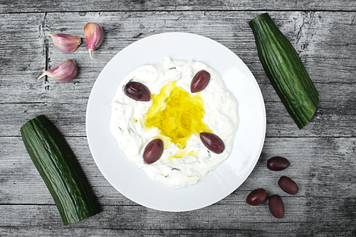 Okurky teď nestrouhám najemno, ale nechávám je ve větších pevnějších kouscích, aby měly texturu. Česnekem šetřím. Kopr dávám podle nálady. Oliváč jenom stranou a míchám si ho až při jídle. Dokonce to se mnou došlo až tak daleko, že tzatziki primitivně převádím na chlebový salát připravený v intencích předchozího receptu.