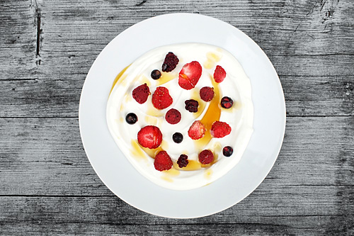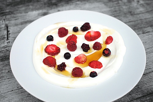 Rozprostřením do tenké vrstvy se ale jogurt rychleji ohřeje a jde i lépe ochutit. Používám na to smrtící kombinaci dehydratovaných kousků ovoce (jahody, maliny, ostružiny, borůvky) a javorového sirupu. Barva a křupavost ovoce mě po ránu hezky osvěží. Javorový sirup zase přidá potřebnou životabudící sladkost.