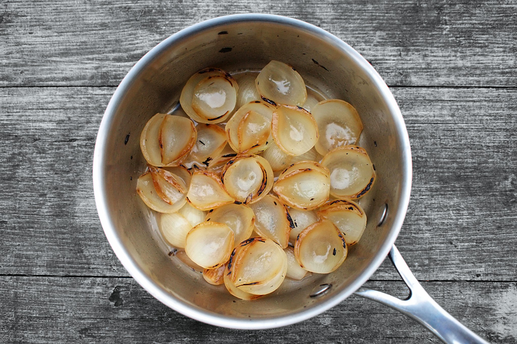 Cibule pak na pánvi rozložte stranou řezu dolů. Volně je přiklopte poklicí a opékejte dočerna asi 5 až 10 minut. Cibule se zapaří a na slupce i trochu orosí. Bude bohatě stačit, když budou spálené jenom ve středu.