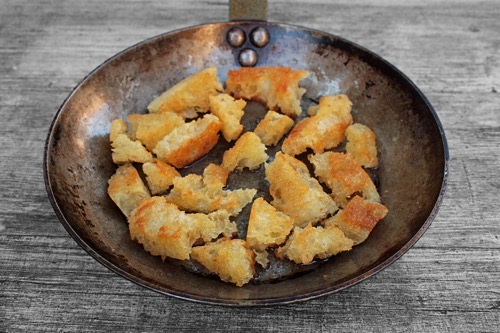 Jde to v pohodě i jen s přepuštěným máslem. Z chleba stačí odkrojit kůrku, natrhat na větší kusy a pomalu péct na mírném plameni za stálého otáčení. Intenzivní a dobré. K vajíčkům (hlavně spíš do salátů) jako dělané.