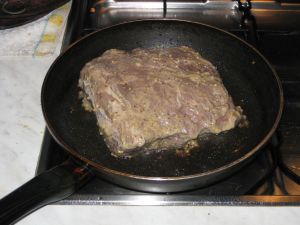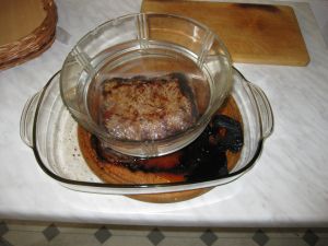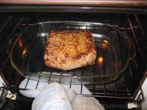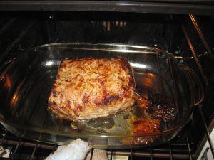 Potom jsem ho dal do předem vyhřáté trouby péct na asi 40 minut při teplotě 180 stupňů. Při pečení pustilo maso trošku šťávy, která se asi po 30 minutách začala připékat. Nechal jsem to a i když to trochu smrdělo spáleninou, tak na výslednou chuť masa to nemělo vůběc vliv.