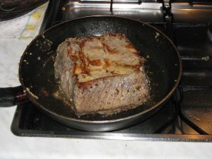 Pak přišla řada na hlavní událost – ROASTBEEF. Maso jsme nejdřív „obdělal“ ze všech stran.