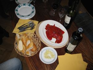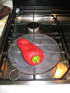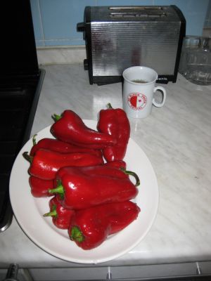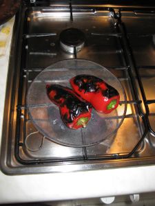Bylo nás na to sedm a i s předkrmem, u kterého jsme se také nechal inspirovat panem Cuketkou, nám to bohatě stačilo. Jako překrm byly pečené papriky – červené slovenské kapie. Nejprve jsem je řádně opálil přímo na plynovém sporáku, až byly zcela černé a potom jsem je pod proudem vlažné vody oloupal. Šlo to neuvěřitelně snadno.