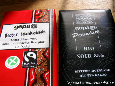 Opět dva výrobky německé firmy Gepa. Obě hořké čokolády jsou v biokvalitě a faitrade, plus bez obsahu GMO. První čokoláda (70%, na snímcích vlevo, 80g za 33,- Kč) mě doslova očarila. Pro výrobu bylo použito kakaou z Ghany :) a z Kamerunu, k tomu třtinový cukr z Kostariky. Navzdory docela vysokému obsahu kakaa si zachovává úžasnou lehkost/vláčnost a sametovou chuť s nádechy kokosu. Sedm a půl (skoro osm) cuketky!
