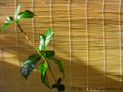 Kousek na titulce je starý asi dva roky a je to vskutku střízlík (zato z něj vyzařuje drnčící feng-shuei). Uznávám, že jsem ho dosud trápil ve špatném substrátu a přeháněl to se sluncem. Kávovníky mají totiž raději polostín nějaké další rostliny (u mně to je vzrostlý banánovník spolu s umbrella tree) a kyselou půdu (např. rašelina 1:1 s kokosovou drtí a pískem) BEZ vápníku (ani v hnojivech, jsou na něj alergické a neprospívají). Na této fotce je starší rostlinka koupená v Hornbachu. Jak vidíte, ta jede jako po másle!