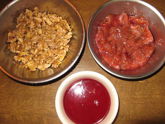 2. Necháme odkapat šťávu ze švestek a svaříme ji na polovinu až třetinu objemu. Švestky vypeckujeme, zbavíme slupky a trochu pomneme prsty. Tyto složky dáme každou zvlášť do mističky.
