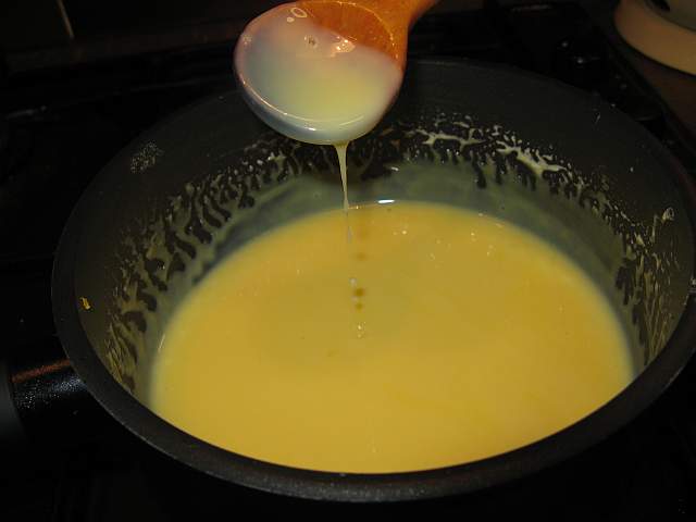 3. Žloutky smícháme s cukrem, pak přidáme mléko. Přesně v tomto pořadí! Kdybychom smíchali žloutky, cukr i mléko najednou, tak nám tam budou plavat kousky žloutků. Dá se to dělat i ve vodní lázni, ale tam se to může srazit taky, já jsem líná a dělám to v silnostěnném titanovém rendlíku na malém plameni. Mícháme, mícháme, mícháme…to je ale otrava. Kontrolujeme na vařečce, jestli je hmota stále hladká. Najednou začne báze houstnout a my musíme bleskurychle rendlík odstavit, míchat a foukat. Nechci malovat čerta na zeď, ale napoprvé to asi nevyjde a najednou to zkrupičkovatí. Nevadí, zachráníme to rozmixováním a poučíme se, že jsme neměli být netrpěliví a přidávat tolik plamen. Příště se to už určitě povede a základ bude hladký. Rozmixované to není úplně ono (je snad jasné, že rozmixované vajíčko natvrdo není totéž co naměkko, že), ale dá se to použít a učený z nebe nespadl.