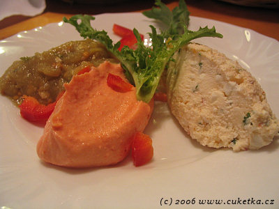 Tato řecká taverna nabízí rozsálou nabídku typických specialit. Jistě, některé věci chybí, ale pokud něco z řecké kuchyně znáte, určitě si vyberete kousek, který stojí za to ochutnat. Taverna se v jídlením lístku honosí řeckým a kyperským původem veškerých surovin. Podrobný obrázek si můžete udělat prostudováním jejich on-line jídelního lístku (na webu Taverny mají starou verzi, tato je z pobočky Old athens, která má na chlup stejnou nabídku).Jako předkrm jsem si dal variaci tří studených pomazánek za 60,– kč. Zleva je to výtečná lilková s česnekem (Melintzana), ještě lepší natierka z tresčích jiker (Taramas) a nakonec ucházející sýrová (Chtypiti).
