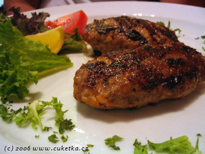 Pojdmě na první hlavní jídlo – Bifteki Jemisto (mleté hovězí a vepřové plněné sýrem) za 200,– Kč. Tomuto kousku se nedalo nic vytknout – štavnatá, příjemná a kouřová chuť z grilu jak má být + výtečná sýrová pl�?ka.