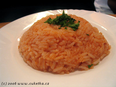 Tady vidíte přílohu, zapékanou rýži s červenou omáčkou – Ryzi pilafi za 40,– Kč. Já osobně tomu říkám rýže s kečupem za čtyřicet :/