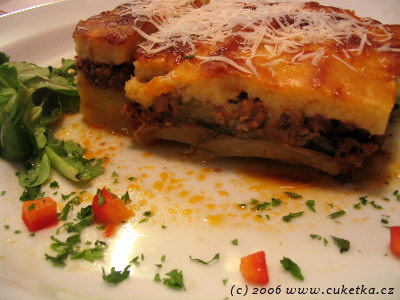 Následuje můj kalibrační pokrm pro řeckou kuchyni – Mousakas (musaka) za 170,– Kč. Musaku zbož�?uju a mám na ní dokonce vlastní moc dobrý recept, který není snadné překonat. Chuťově velmi dobrá – výborně zapečený bešamel, masová pl�?ka průměrná, vyspravil to vynikající základ z lilků a cuket. Ale ta prezentace? Vidíte ten dokrojek opřený o hlavní porci? To jako, že aby nezůstal v pekáči tak mi ho tam připrdli, no kde to jsme? Tímto u mne celé jídlo potopili. Takto upravenou porci jsem naposledy dostal v roce 1988 ve školní jídelně ZŠ Míru v Ostravě ;)