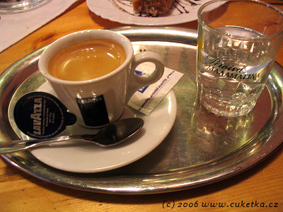 Káva Lavazza za 35,– Kč. Servis odpovídající, ale zatím asi nejkyselejší Lavazza, jakou jsem kdy pil. Za roztomilou retro skleničku s vodou a řeckým nápisem, kterému nerozumím, + bod ;)