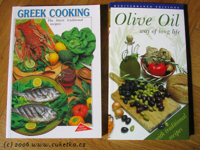 Tohle jsou mé jediné dvě knížky, které mají co do dočinění s řeckou kuchyní. Jsou to takové ty tradiční, docela blbé turistické knížečky za deset euro, které potkáte na každém rohu v každé turistické desitnaci. Úplné kraviny tam nejsou, ale spoléhat se na ně rozhodně nedá, takže aspoň čumím na ty obrázky uvnitř .)