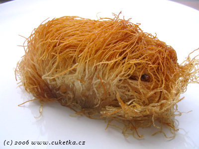 Podle mne dokonalý „conversation starter“ – dezert z nitkového těsta. Esteticky mne tahleta „věc“ přivádí do ekstase. Chuťově už je to o něco slabší zážitek než klasická baklava, ale i tak je to síla. Je to také variace na téma těsto, oříšky, med a sirup. Doneste si jeden dva domů a neuvěříte!!! :)