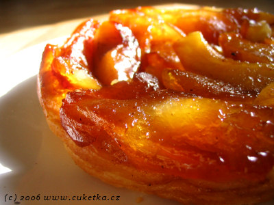 Milý Cuketko, moc zdravím. Vaše pátrání po tajemství Tarte Tatin mě kdysi dovedlo až k receptům ve francouzštině (aniž bych uměla cokoliv jiného než „bonžúr“) a rukám spáleným od vyteklého karamelu… Teď ho peču moc ráda, obyvlášť s originál křehkým těstem (zdá se mi daleko lepší než kupované lístkové), do kterého dávám 150g mouky, 75g studeného másla, 2 vrchovaté lžíce cukru (v originálních receptech nebylo), 5 lžic studené vody a špetku soli. Rychle zpracuji rukama a nechám v lednici odpočinout 2 hod. Je to máslová mňamka.