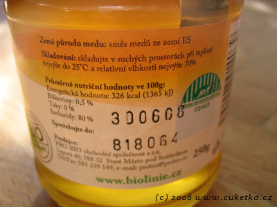 Malinkatý a velice drahý med v biokvalitě, tak to jsem si nemohl nechat ujít. Momentálně se myslím jedná o jediný med v biokvalitě v ČR (na trh dovává firma Biolinie). Bohužel si nekjsem jistý jestli ten med pochází z Česka, na obalu totiž najdete klasickou hlášku: směs medů ze zemí ES :(