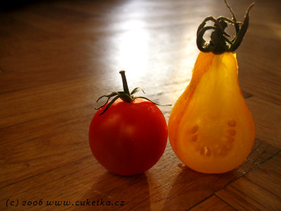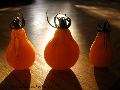 … je k zbláznění! Tyhlety hruškodní cherry zázraky vidím snad poprvé. I když se navenek prezentují exotickým tvarem, chuťově mají oproti svým kulatým variantám ještě co dohánět. Přesto, jako dekorace na talíř, nebo jen tak na koukání jsou nesmírně atraktivní ;)