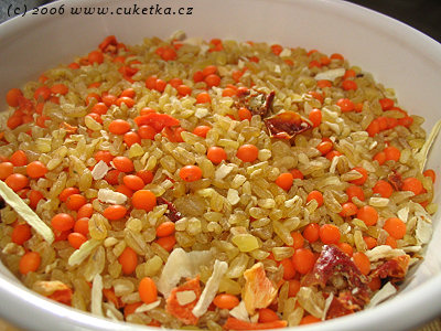 Já jsem se stím však moc nemydlil, skouknul jsem složení (bulgur, červená čočka, bio vegeta, sušený česnek, cibule, celer, paprika) a rozhodl jsem se, že si udělám kaši, kterou udělám na cibulkovém základě. Toto se ukázalo jako velice šťastná volba, protože výsledná bulgurovo-čočková kaše byla naprosto fantasická. Výborná konzistence, ochucení i složení jednotlivých surovin. Pro absolutní ekstasi jesm ještě vmíchal stroužek drceného česneku, trošku petrželky a kvalitní olivový olej.
