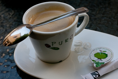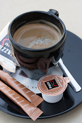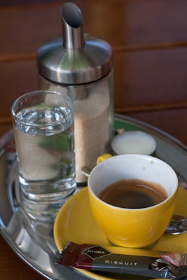 Skoro fatálně příznačný název pro dnešní akci. Luboš už toho měl plný řídítka (není se čemu divit), takže odkráčel k domovu a v posledním podniku otevírali až ve tři hodiny odpoledne. Já jsem si tedy dal krátký pochod po kopcích v okolí berounského ďolíku a po návratu objednal z posledních sil pouze jediné espresso s dodatkem, že by to mělo být to nejlepší espresso, jaké dovedou zkonstruovat. Velice milá obsluha nezaváhala a předložila kávu v plné soupravě! Nudle dojetí nebyla daleko od ukanutí, s povděkem jsem přijal a okusil:Espresso z africké fair-trade kávy (30,–)