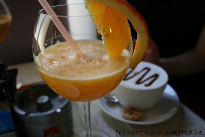Kompletní jídelní, nápojový i vinný lístek je on-line, takže neváhejte – vše si můžete do detailu prostudovat včetně cenových relací. V nabídce dominuje italská kuchyně – najdete tam snídaně, předkrmy, saláty, různé druhy sendvičů, těstoviny a dezerty. Vše odpovídá konceptu, tj. nic seriozního/těžkého, pouze rychlá lehká jídla na snídani, svačinu nebo krátký oběd. Konec plkání, pojďme to omrknou naživo!K pití jsme si dali černý čaj s citrónem (48,– Kč), neperlivou vodu Aquila (36,– Kč) a čerstvě vymačkanou pomerančovou a jablečnou šťávu (á 79,– Kč). Na obrázku vidíte kitschi servis pomerančové štávy – pěkné, čerstvé, osvěžující. Podobně vypadala i šťáva jablková.