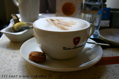 Na titulce pak máte Caffè latte cioccolata (64,– Kč), tady potom standardní Caffè latte (58,– Kč). Značku Tonio Lamborghini kvituji s povděkem a ani tady nezklamala. (Z)latíčka byla perfektní, mléčná pěna neprůstřelná (dalo by se na ní ustlat), k tomu nahřáté velké šálky a bonusový keksík. ňíkám – o.k.!