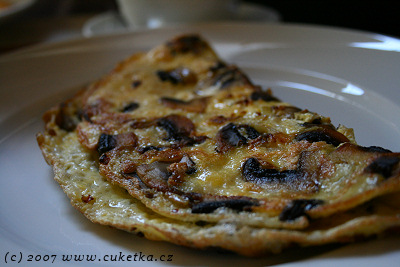 Samá vydatná jídla jsme si dali. Tady fotogenická vaječná omeleta s houbami a cibulí (85,– Kč), na kterou jsem neslyšel žádnou stížnost a zmizela beze zbytku. Jak vidíte sami ani snítka či lísteček, natož plátek zeleniny. Tomu říkám minimalistický servis.