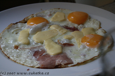 Podobně jsou na tom i klasická pečená vejce se šunkou a sýrem (89,– Kč). Chuťově v normě, ale ta úprava! Pěkněji by to zvládl snad i desetiletý vnouček instruovaný svou nahluchlou babičkou! :/ Ke třem omeletám nám přinesli jednu objednanou ošatku s dostatkem pečiva (celozrnné, bageta) za 20,– Kč, k tomu jeden neobjednaný kalíšek s máslem za 15,– Kč.