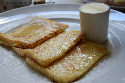 Vyzkoušeli jsme i inzerovanou novinku v menu – opečené tramezzini s medem a cukrem (64,– Kč). Tramezzini jsou sendviče s různou náplní z velice tenkého bílého toastového chleba s odkrojenou kůrkou. V této verzi to byl zřejmě bílý toastový chleba vymáchaný ve vajíčku, opečený, zalitý medem a posypaný cukrem. Tramezzini se jim povedlo naštelovat velice atraktivně a myslím, že i ta receptura by stála za hřích. Mňamka, na kterou už nevyšlo místo!