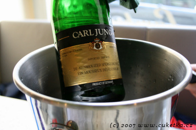 Nově jsem provedl i svou oblíbenou „cuketkovu funky objednávku“, což se rovná objednání jakékoliv alespoň trochu obskurní, či alespoň provokující položky z menu a poté pobavenému pozorování, jak se obsluha s objednávkou vyrovná. Vzhledem k charakteru naší snídaně jsem vybral Carl Jung nealkoholické šumivé víno (295,– Kč), na které jsem byl „opravdicky“ zvědavý. Bohužel „cuketkova funky objednávka“ byla zacílena naprosto přesně (tj. na komoru) a obsluha si na ní překrásně vyrazila svůj pěstěný chrup.