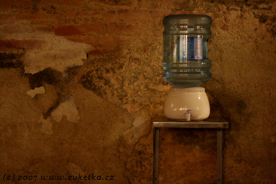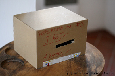 Další vtipný detail na pánských záchodcích. Jak všichni víme, čůrající cizinec je nechopen racionálně uchopit směnný kurz! ;)) (Krabice i se stojanem potom z WC zmizla, v den plánované návštěvy ministra kultury… ;)