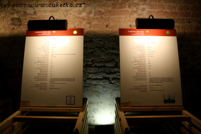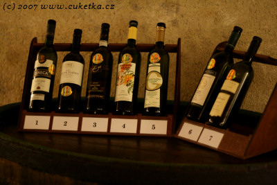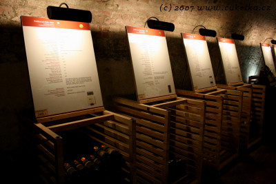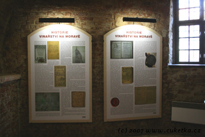 Každé víno má svůj vlastní regál s lahvemi a informačním panelem, který je na poměry neskutečně nabitý informacemi (krom obligátních údajů tam najdete typ půdy, datum sklizně, výnos, cukernatost, č. výrobní partie, počet lahví, zbytkový cukr, kyseliny, alkohol, bezcukerný extrakt, doporučenou lahvovou zralost). Údaje v katalogu, který k volné degustaci dostanete jsou pak úplně shodné a netřeba vám tak běhati od panelu k panelu. Možno dokonce kolečka u favoritů malovati!