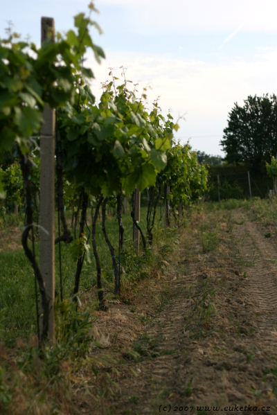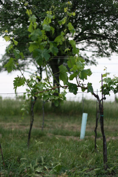 Ukázkový keř révy vinné. Obilí dole je příznakem tzv. integrované produkce. Je to systém hospodaření, který má za cíl zvýšení biodiverzity a snížení ekologické zátěže = rozuměj měkčí BIO.