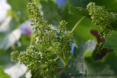 Takhle kvete réva vinná. Na místě každé té jedné anténky se udělá bobulka. Z bobulky bobule.