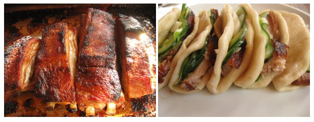 Jedna část receptu upečena a sežrána. Boule za ušima! Vzhledem k mé pohodlnosti a lehlému odporu k plácání jakéhokoliv těsta jsem vyzkoušel pouze bůček. Protože se mi zdál trochu podobný pekingské kachně, zvolil jsem k němu jasmínovou rýži, hoisin,kimchi. Výborné, musel jsem se držet, abych ten kusanec bůčku nesežral celý. Hoisin i kimchi není nutné, samotná chuť bůčku je tak výrazná, že s rýží nemá chybu. Další komponenty vyzkouším, jakmile někoho donutím uplácat těsto a okurky nebudou ze skleníku. Bůček zblajznu zítra s libanonským chlebem.