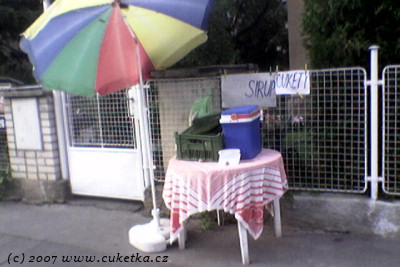 Nevěřil jsem svým očkám! ;) Na obrázku vidíte prostřený stoleček s designovou ochranou proti škodlivému UV záření. Na stolečku bedna s vypasenými cuketami a přenosný termobox s višňovým a malinovým sirupem. Na plotku igelitové tašky zdarma a informační cedulky – Čerstvý rybízový sirup, je prospěšný zdraví. Skladujte při 20 °C.