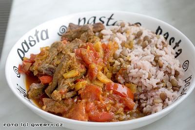 Jako přílohu jsem zvolil zjednodušené khirčí, neboli rýži vařenou zároveň s čočkou v poměru 1:2 ve prospěch rýže. A co že z tohoto plyne? No plyne z toho ponaučení, že kuchyňské výmysly neznají hranic, ať už náboženských, zemězpytných či ingredienčních. Za půl hodinky už Qwerťák seděl s nosem v korytě, šalamounsky mňam mlask chrochtav „Muhehehehe… hinduisti přece krávy nejedí! Takový nesmysl!“