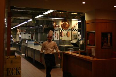 Podnik byl zaplněný řadami malinkatých stolečků s upovídanými strávníky a svítilo se tam dvojicí umělohmotných červených lustrů. Prostíralo se jednorázovým papírovým ubrusem a naši objednávku nám psala slečna rovnou na účet, který zůstával na našem stole (na konci se platí u pokladny). Kuchyně byla hned vedle jídelny a tak jsme mohli skrz dvě výdejní okýnka sledovat kuchaře, jestli se nedloubou v nose! ,)