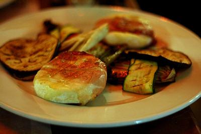 Neptejte se, jak se nám podařilo objednat, nicméně nakonec na našem stole přístál grilovaný sýr ve slanině s kupkou grilované zeleniny. V originále to bylo Robiola piemontese e speck, alla brace, con patate nocciola. Eh, sedí to vůbec? Nám to bylo docela jedno – sýr i zelenina (dva druhy čekanky, lilek, cuketka) byly výtečné!