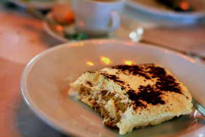 K tomu všemu jsme pili Barolo, o kterém jsme bohužel nezjsitili víc. Jazyková bariéra i tempo zde byly smrtící! Na závěr jsme vše pojistili čokoládovo-hruškovým dortíkem, tiramisu (na obrázku) a kafíčkem. Tiramisu trošku šlehačkové, ale kafíčka ukázková (= za poslední rok bych příklady espressa v této kvalitě z Česka spočítal na prstech jedné ploutve). Ach jo… ;)