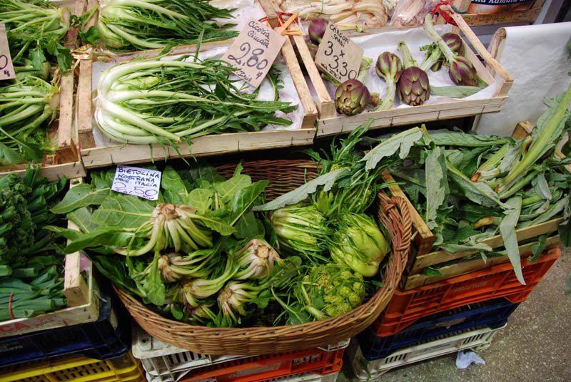 Podle mne je ona zelená potvůrka podivná druhově Cicoria, což je výraz pro skupinu této listové zeleniny. Jinak může mít různé druhové příbuzenstvo, kteréžto se liší podle tvaru listů a síly stonku, jako Brindisina, Catalogna (což je přímo ona zubatá modelka na obrázku), Pan di zucchero, Bianca di Milano… Každopádně nejlepší úpravu „cicorie“ jsem ochutnala v Římě, famózní CICORIA RIPASSATA : listy se 3× vyperou ve studené vodě (divili byste se, kolik je v nich neřádu), poté se v litinovém hrnci krátce pošírují, následně slijí, a pak šupky dupky zprudka opéct na olivovém oleji, na němž se nechá předtím zezlátnout česnek a peperoncino (ďábelsky pálivá italská paprička)