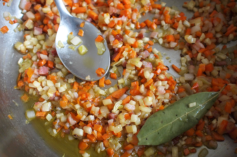 Slaninu a kořenovou zeleninu nakrájejte na opravdu jemné kostičky (velmi od oka brunoise). V široké pánvi s vysokým okrajem nebo v kastrolu začněte se lžící másla a se slaninou na středním plameni. Počkejte, až slanina vypustí všechn tuk a až začne lehce chytat barvu.