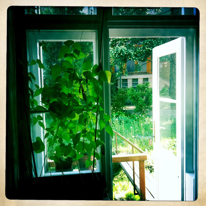 První várku jsme zasadil jen tak ze srandy do samozavlažovacího truhlíku za oknem někdy v březnu. Substrát co dům dal a fazolky asi 5cm hluboko. K tomu dvě bambusové tyčky, špagáty na šplhání a bylo hotovo. Moc šancí jsem to mu nedával, ale zadařilo se a už se mi tam klube asi deset macatých lusků. Byl to takový planý pokus, protože jsme byl netrpělivý a nechtělo se mi čekat do května na poslední mrazíky, po kterých je k setbě fazolí ten správný čas.