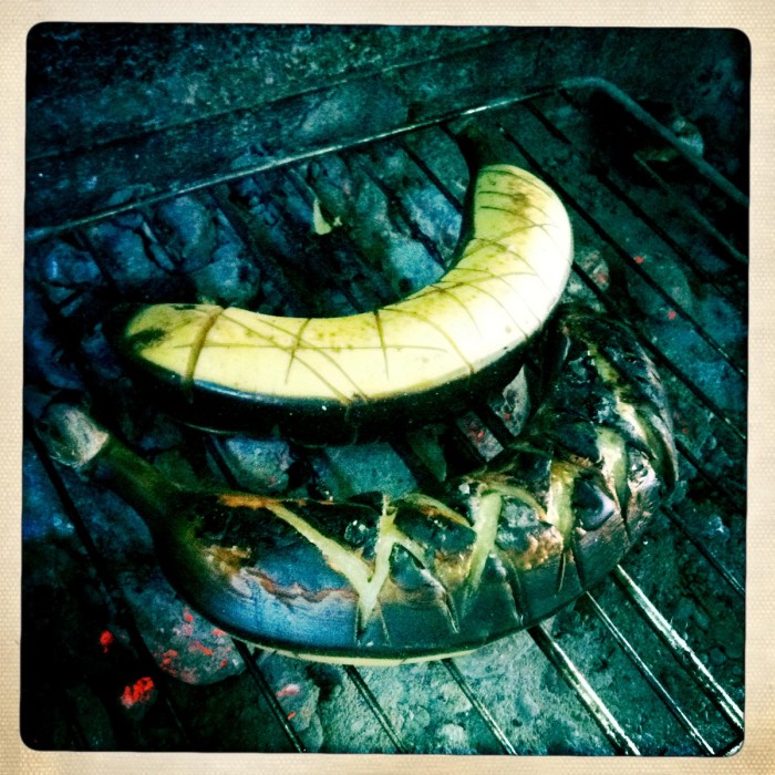 Přijde vhod na konci grilovačky, když už máte všechno maso a zeleninu v sobě a když už se nikdo nestará o oheň. Vezmete banány (starší, tečkované) ve slupce a křížem krážem je naříznete na povrchu. Potom je dáte na mřížku grilu a dál už se o ně nestaráte. Až jsou na povrchu úplně černé, uvnitř měkké a se zlatým karamelem v průzorech slupky — máte hotovo. Podávejte se lžičkou.