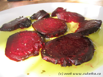 Od loňské návštěvy řecka jsem převzal tamní úpravu řepy: celou uvařenou řepu v sladkokyselé vodě (cca 45 minut) olupeme a nakrájíme na kolečka tlustá cca 0,5 – 1 cm, přelijeme olivovým olejem, ochutíme čerstvě namletým pepřem a solí. Následuje ekstase ;)