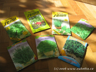 Každý rok si vysazuju do terakotového květináče několik bylinek (a každý rok mi je nakonec sežerou mšice ;). Letos jsem si vybral tuhle základní sortu: pažitku, libeček, tymián, petržel, bazalku, bazalku trpasličí a majoránku. Zvlášť mám ještě uložený rozmarýn a přikoupím samostatnou dobromysl (oregano) a mátu (mám obrovskou spotřebu na míchané drinky Mojito nebo Caipirinhu – návod bude ;o) Nemusím vám snad vysvětlovat, jak jsou čerstvé bylinky a koření výtečné. Např. čerstvá bazalka – té se nic nevyrovná!