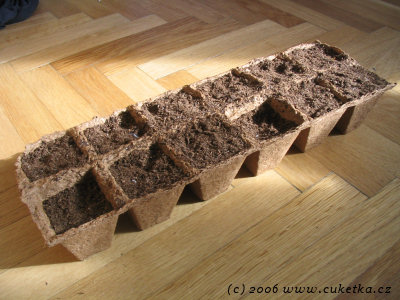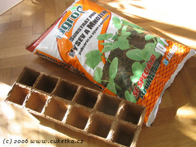 Další věc je správný substrát pro klíčení. Doporučuje se použít speciální výsevní substrát (7l za 34,– Kč) – rostlinky jsou pak odolnější a silnější. Teprve potom až trošku povyrostou je přesadit do zahradnického substrátu, nebo do spešl substrátu pro bylinky (7l za 28,– Kč). Já sobně jsem to dříve sadil rovnou, bez toho výsevního substrátu a zas tak moc rozdíl nebyl. nakonec ještě budete potřebovat nějaké menší kelímky (klidně od jogurtu), já použil tyhle lisované samorozpadavé.